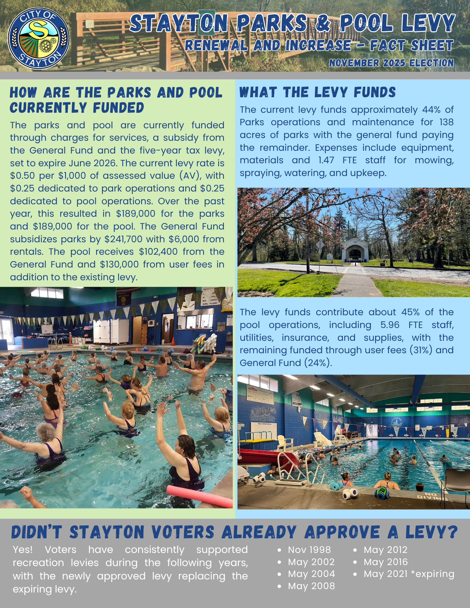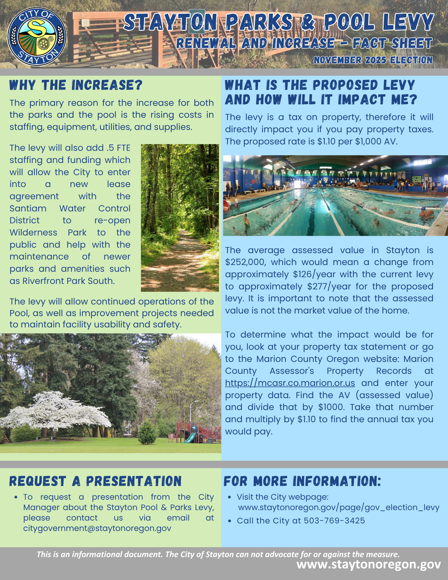 For more information, please see the Stayton Parks & Pool Levy Renewal and Increase Fact Sheet.