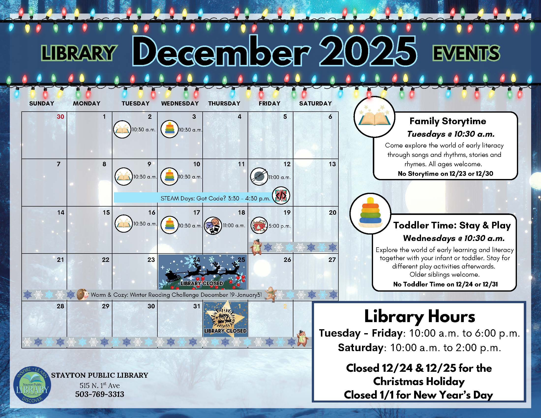 For the safety of our patrons and staff, City offices and facilities will remain closed to the public today. This includes the Stayton Public Library. All programming is cancelled for February 13th.