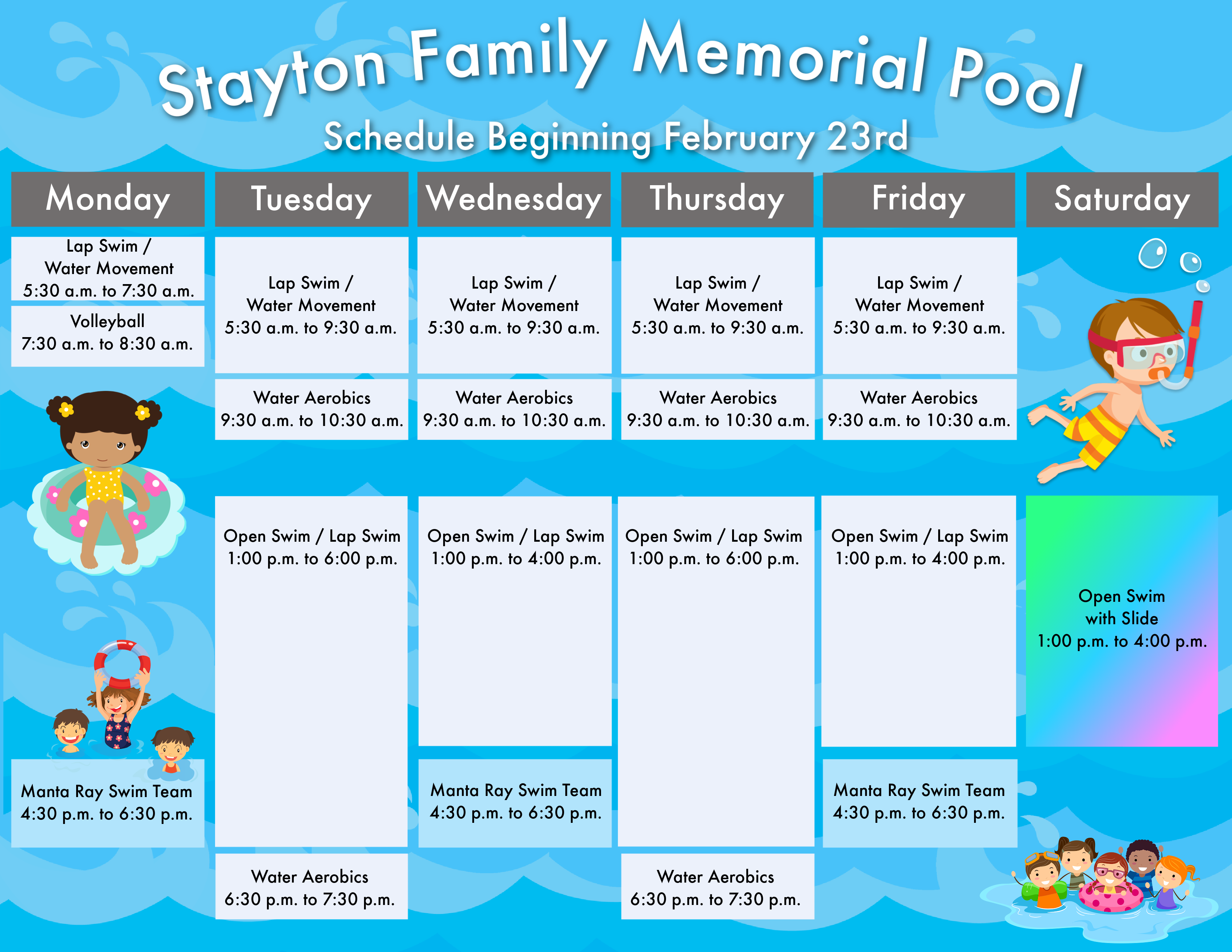 Beginning Tuesday, February 22, 2022, the Stayton Family Memorial Pool will have updated hours.