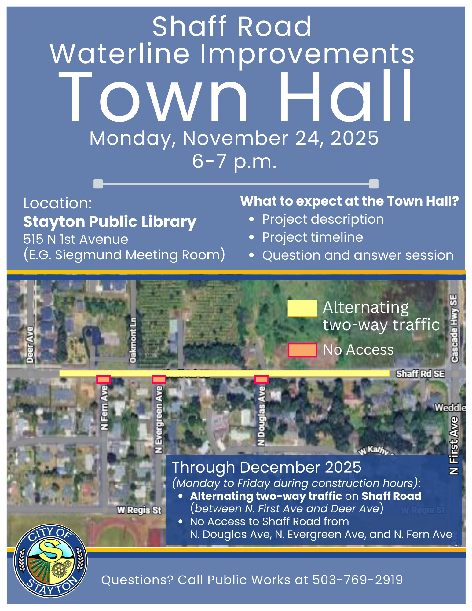A Town Hall for the Shaff Road Waterline Improvements project is happening on Monday, November 24, 2025 from 6-7 p.m. at the Stayton Public Library (515 N 1st Avenue) E.G. Siegmund Meeting Room.