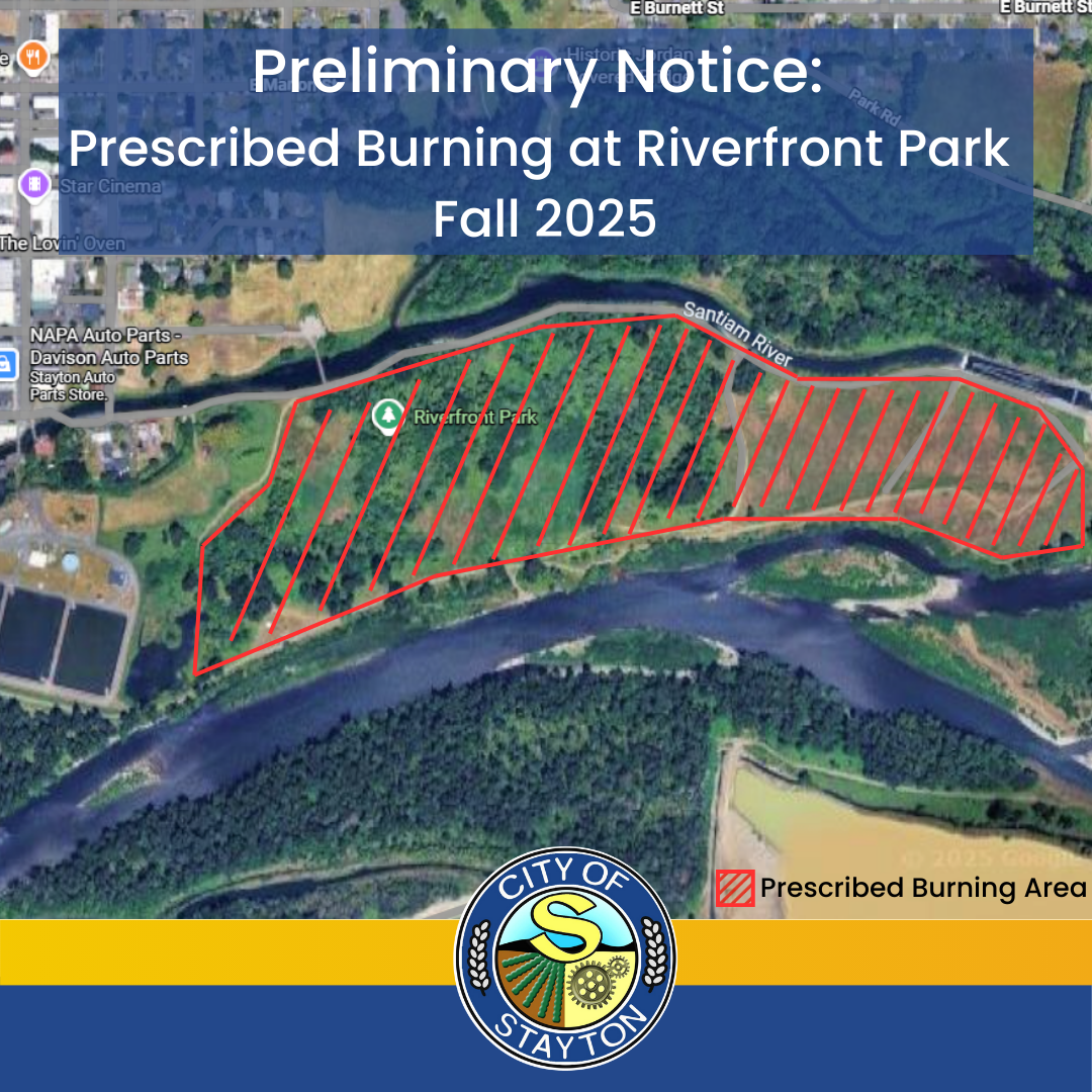 The City of Stayton is providing preliminary notice that it will be conducting prescribed burning at Riverfront Park in Fall 2025.