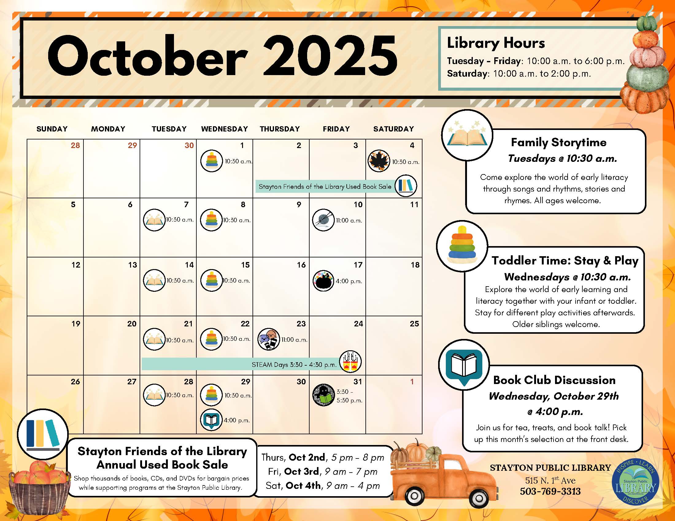 Fall into a month of excitement, creativity, and community at the Stayton Public Library! Check out what’s happening this October: