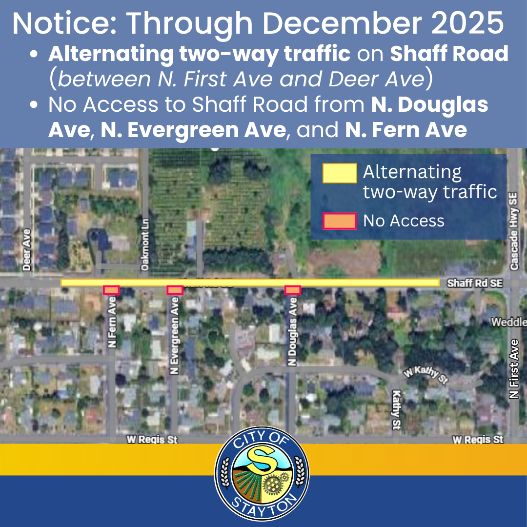 A Town Hall for the Shaff Road Waterline Improvements project is happening on Monday, November 24, 2025 from 6-7 p.m. at the Stayton Public Library (515 N 1st Avenue) E.G. Siegmund Meeting Room.