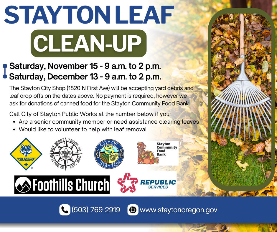 The Stayton City Shop (1820 N First Ave) will be accepting yard debris and leaf drop-offs on the dates above. No payment is required, however we ask for donations of canned food for the Stayton Community Food Bank.