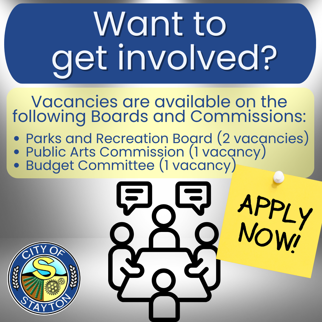 The City of Stayton currently has vacancies on the following Boards, Commissions, and Committees:
