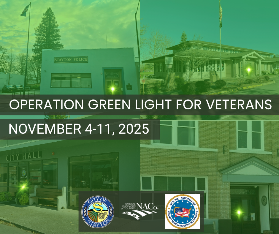 The City of Stayton will be participating in Operation Green Light for Veterans from November 4 and 11. We encourage everyone to “light the town green" by placing a green light in windows or using a green bulb for outdoor lighting.